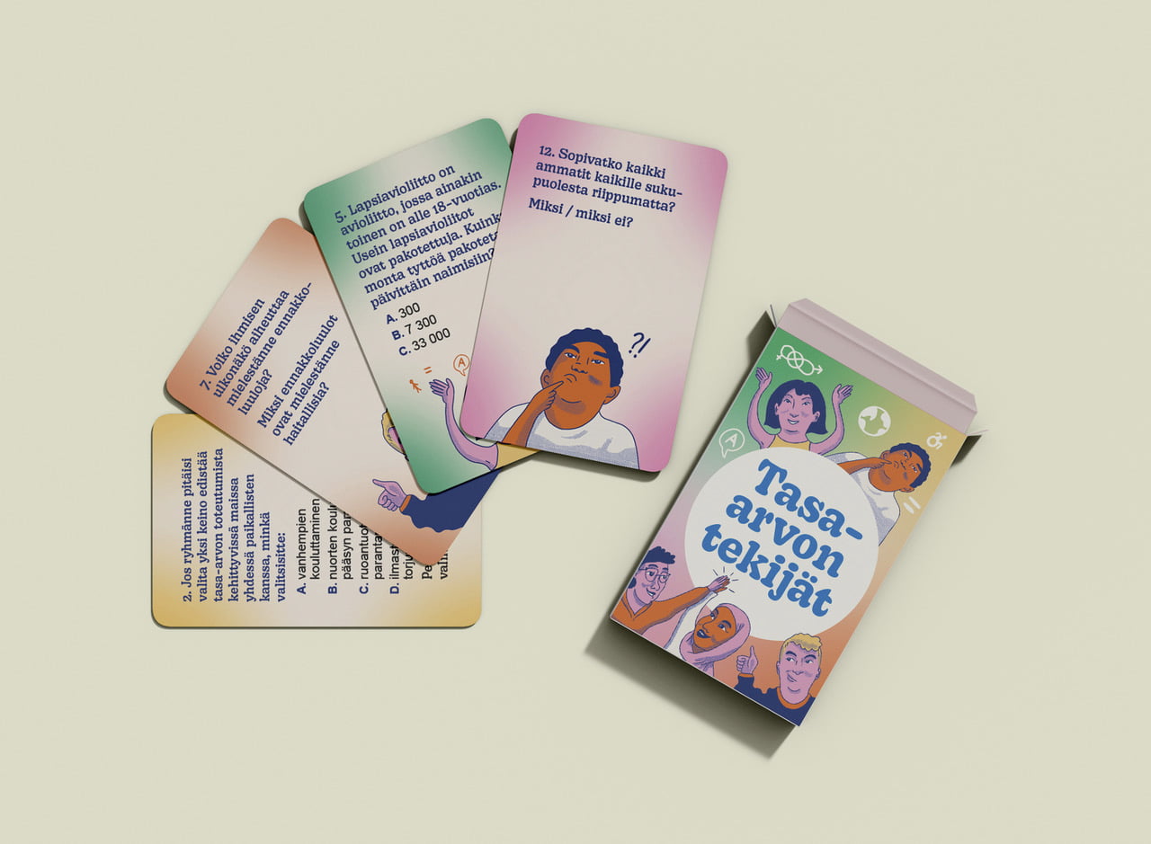 Uusin globaalikoulun tuote on Tasa-arvon tekijät -peli. Pelin avulla saa taatusti luotua keskustelua hiljaisempaankin ryhmään tai luokkaan. Pelikortteihin on helppo tarttua, sillä ne on kirjoitettu selkeällä kielellä ja kuvitettu hauskoilla Noora Ketolaisen luomilla hahmoilla.