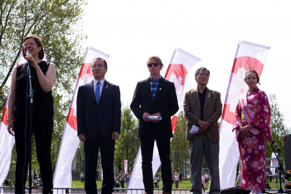 - Alkupuheiden pitäjät vasemmalta oikealle: Helsingin varapormestari Anni Sinnemäki, Takashi Murata, Japanin suurlähettiläs suomessa sekä tulkki, Norio Tomida, kirsikkapuiston isä, Venla Ailasmäki, suomen kirsikankukkakuningatar.