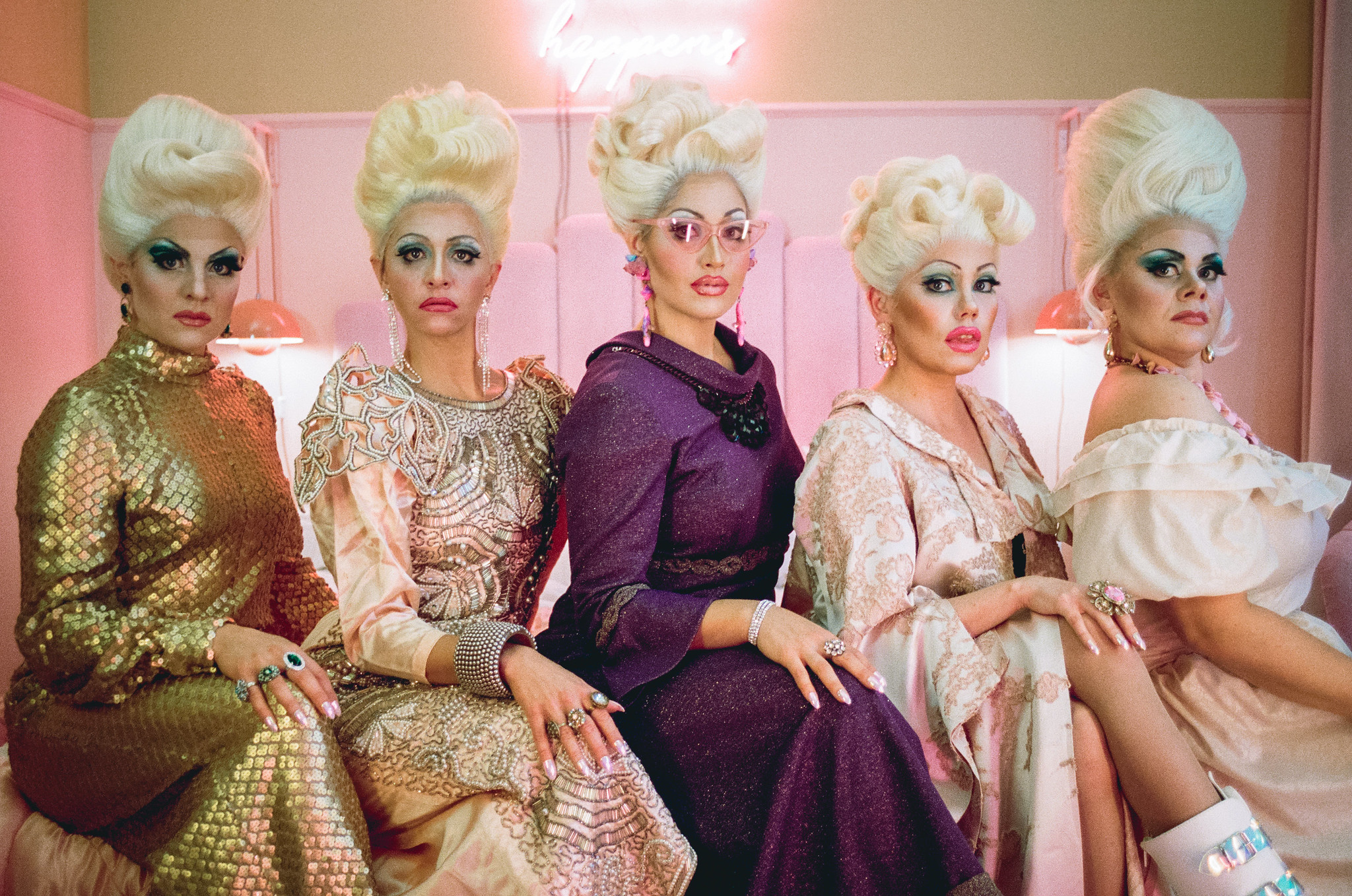 Näyttämön seinät on vuorattu vaaleanpunaisilla verhoilla ja lavasteista korostuvat teatterin meikkauspöytä, ylellinen sänky, antiikkipuhelin ja kylpyamme. Esityksen alkaessa hämärän keskeltä erottuu viisi uupunutta hahmoa, joilla kaikilla on korkeat valkoiset peruukit ja runsas ehostus.