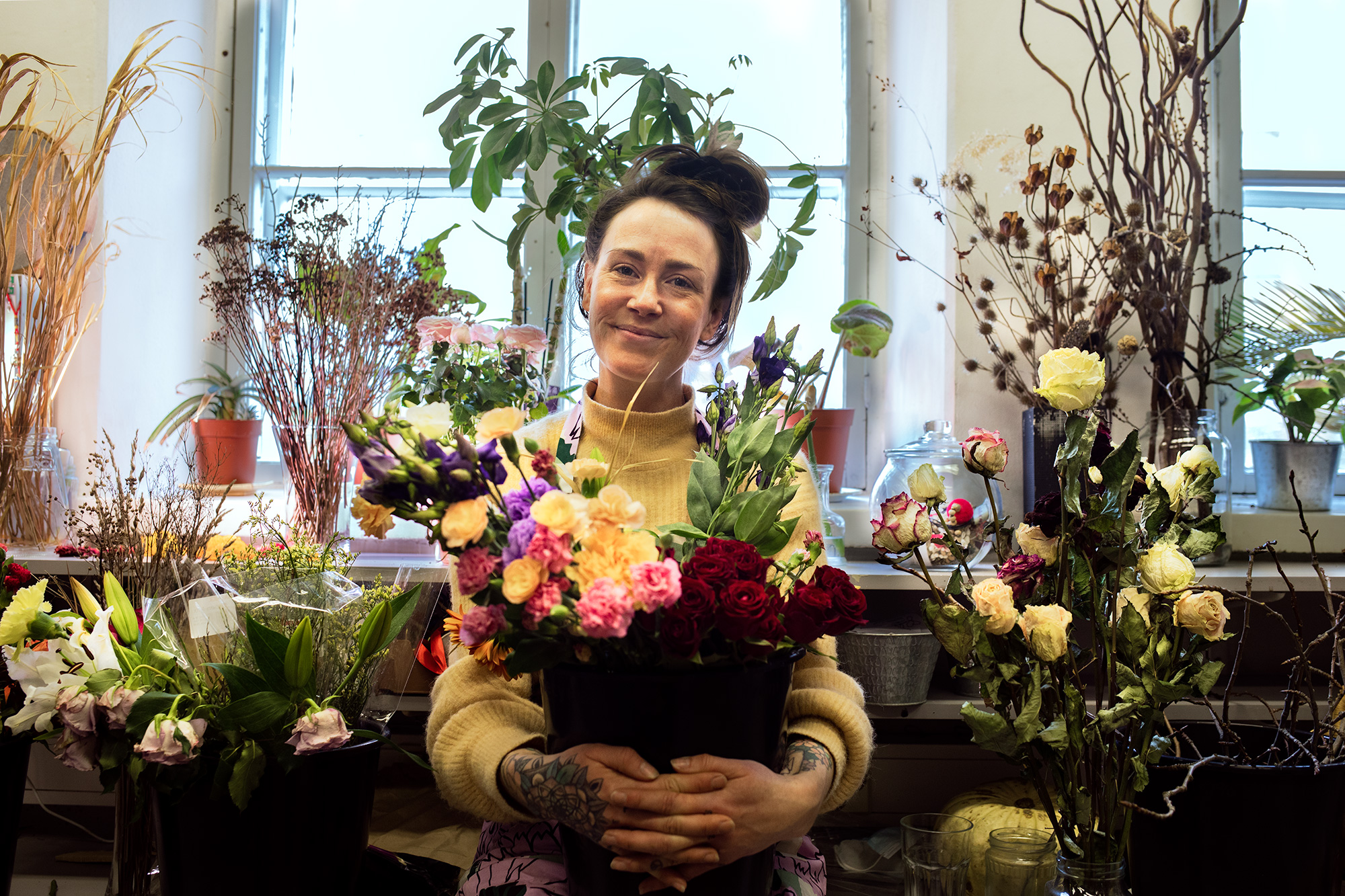 Itseoppinut kukkakauppias Kunnaala innostui kasveista työskenneltyään Espanjassa permaviljelyn parissa. ”Kukkakauppa oli äitini unelma. Hän on nyt eläkkeellä ja auttaa minua myymälässä kesäisin.”