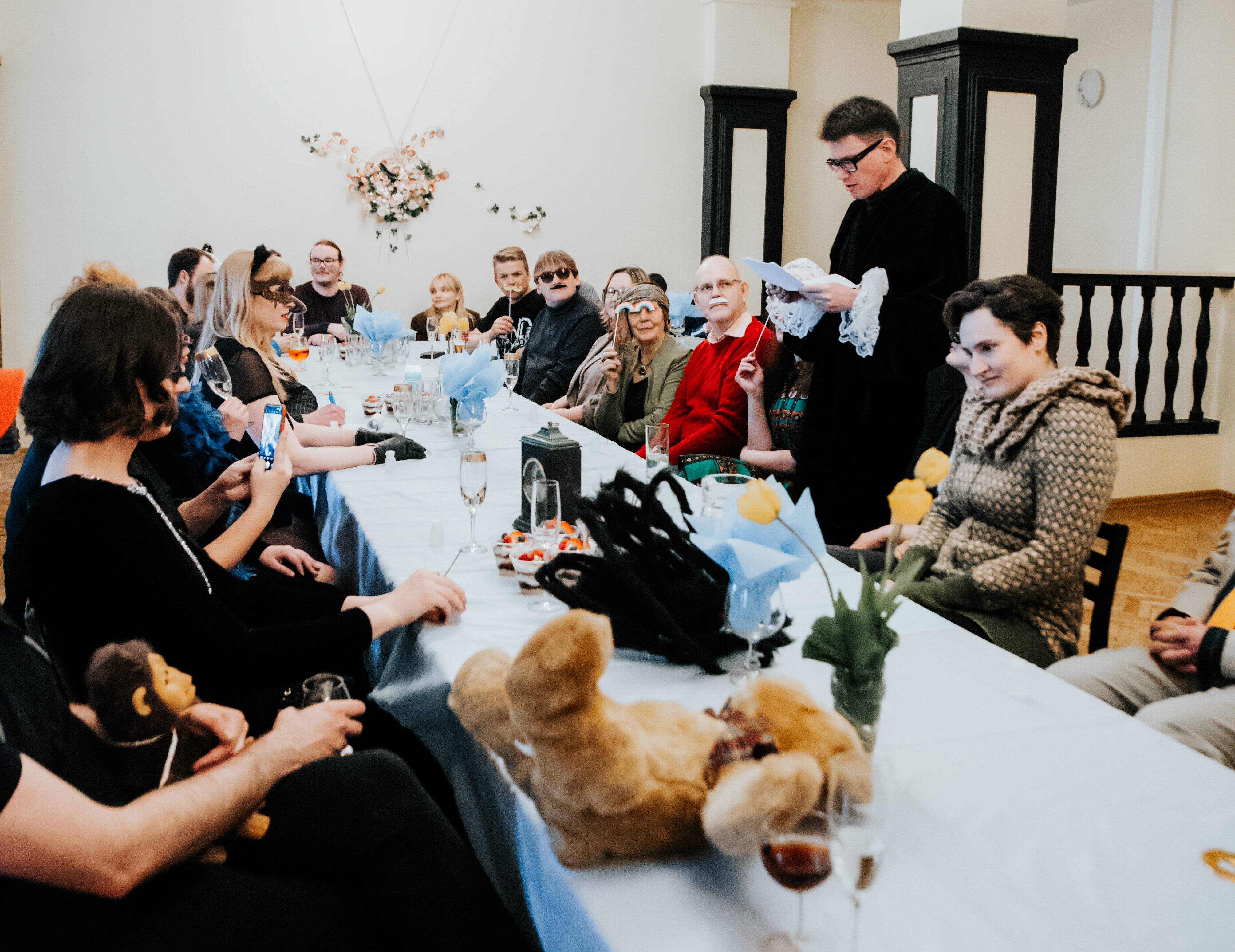Kirjailija, Tarton esidandyksikin kutsuttu Kaspar Jassa piti dandyjen naamiaisissa päivällispuheen. Kuva: Karoliina Viilukas