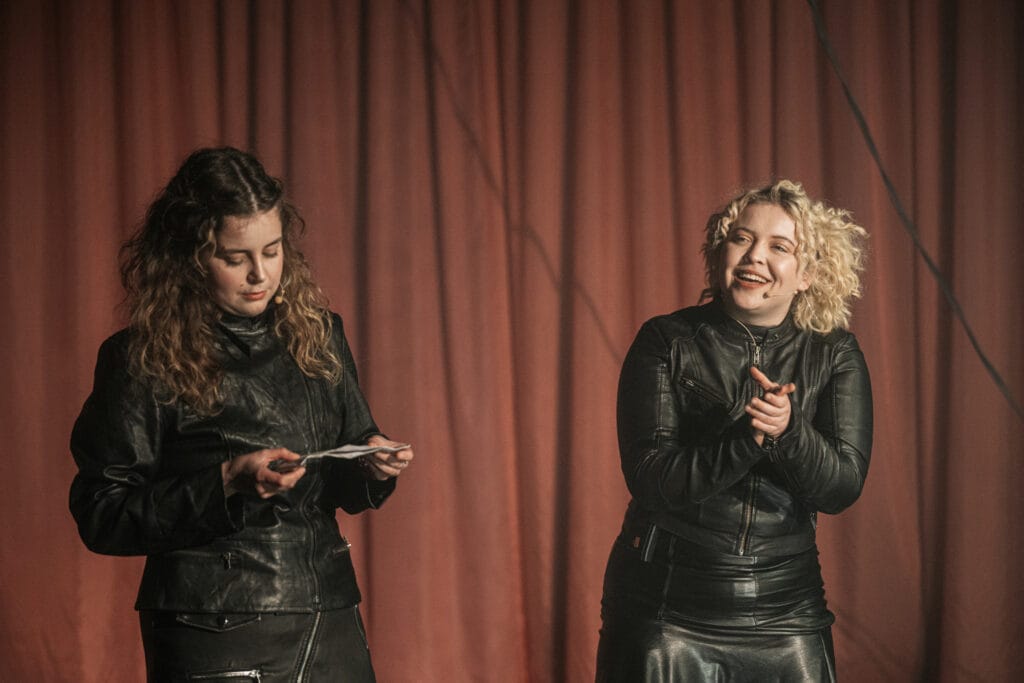 Kaksi ihonmyötäisiin nahka-asuihin pukeutunutta nuorta naishahmoa asettuu näyttämön valokeilaan alkaen ilmentää tarinoiden ja vaivaantumisen eleiden kautta esineellistävän katseen kohteena olemista. Myöhemmin asut vaihtuvat, mutta jatkuva sisäistetyn häpeän tunne kertautuu tavoilla ja toisilla.