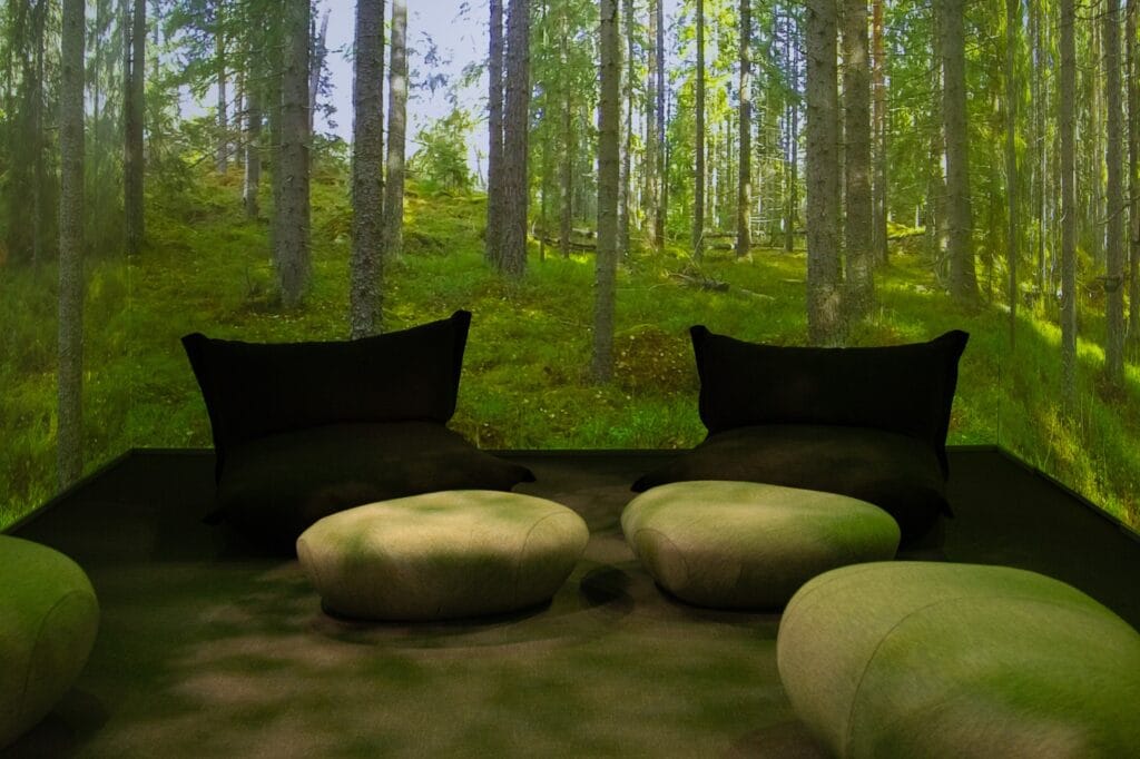 Jo yksin luonnon äänten kuuleminen edesauttaa rentoutumista ja stressistä palautumista. Ääniympäristöön yhdistetty videokuva on tässä suhteessa tehokkaimmaksi havaittu kokonaisuus, sanoo Tyrväinen. Tilaan on asennettu vuorovaikutteiset seinät, joita koskettamalla tilan käyttäjä voi hakea ja valita käyttöönsä järjestelmään ladattuja sisältöjä. Niiden joukossa on esimerkiksi meri-, järvi- ja puutarhamaisema.