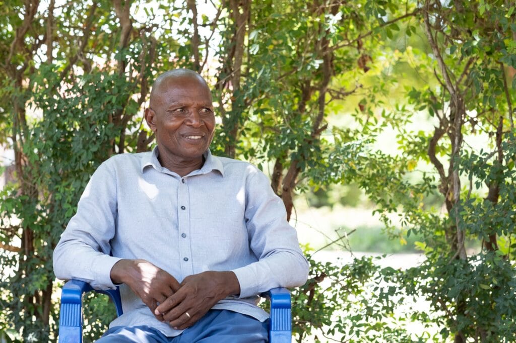 Nyt Orestus Kinyero kävelee istutettujen puiden välissä ja tarkastelee niiden kuntoa. Häntä hymyilyttää.