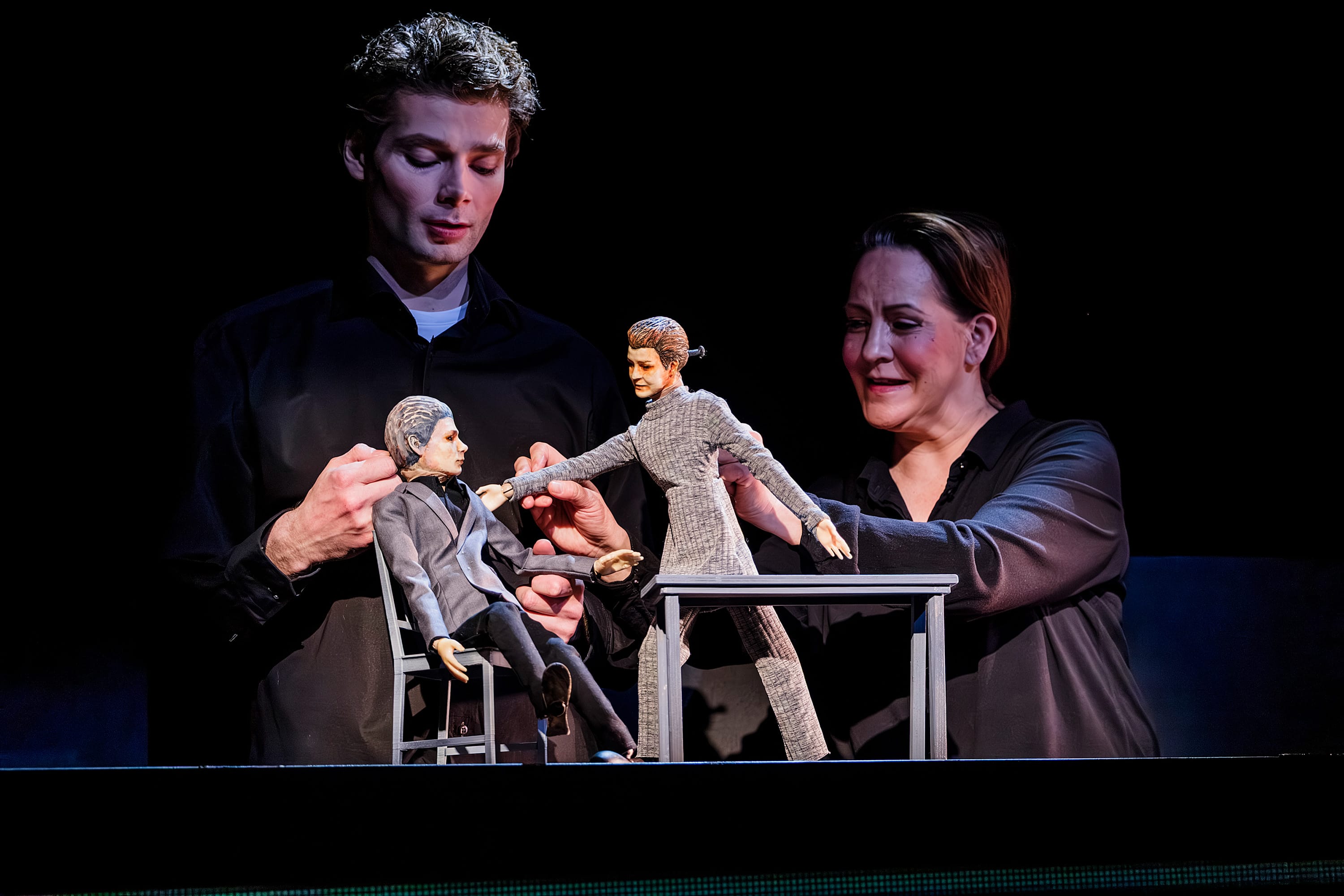 ”Minulle on tärkeää, että lavalla on eri yhteiskuntaluokkia, että se tapahtuu kolmessa eri maailmassa ja hieman eri tavalla kussakin”, sanoo esityksen ensi-illan perässä Helsinkiin matkannut Maja Zade. ”Ja olennaista on sekin, että teatterimaailman Mikael pelaa aktiivisesti näillä vinoutuneilla rakenteilla.”