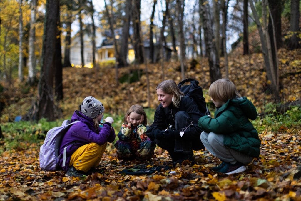 Tampereen luontokerhossa Aino Jäälinoja jatkaa leikkiä lasten kanssa.