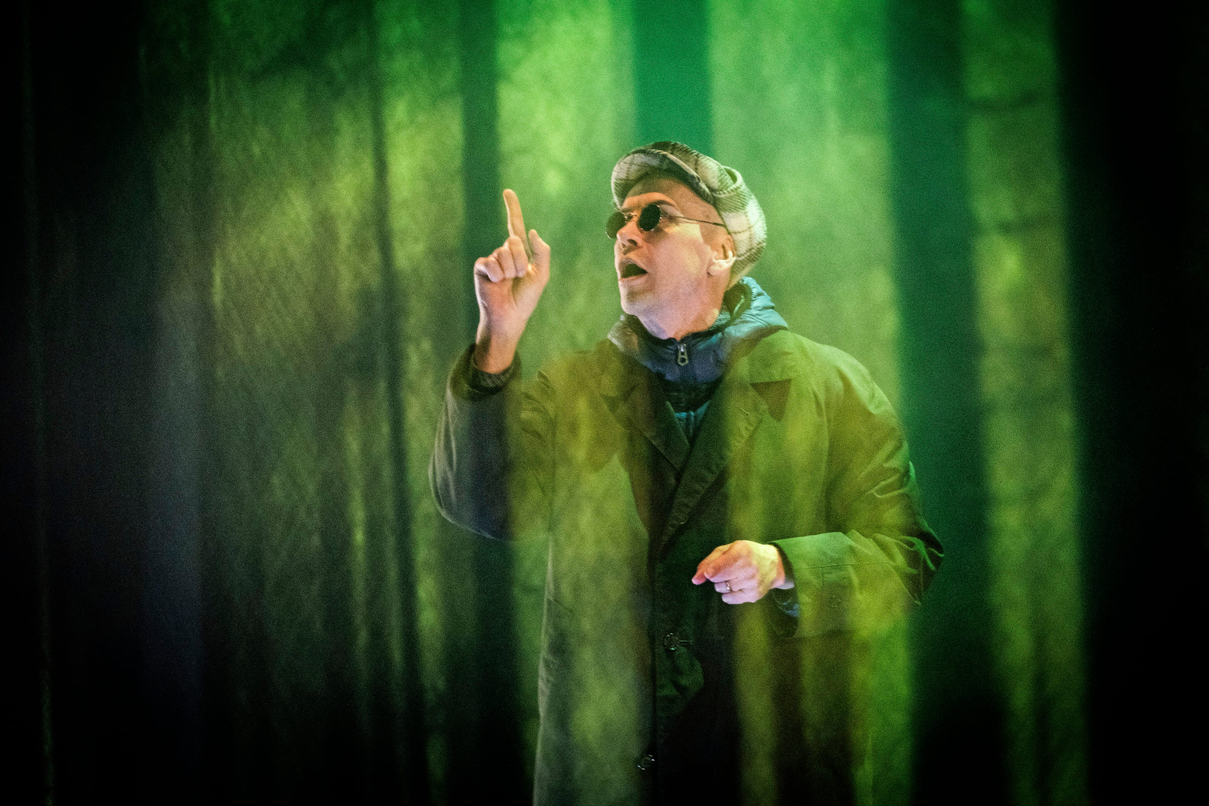 Pavel Semchenkon ja Aniisia Kronidovan videoprojisoinnit istuttavat näyttelijöitä (kuvassa Jussi Johnsson) hyvin erilaisiin ympäristöihin.