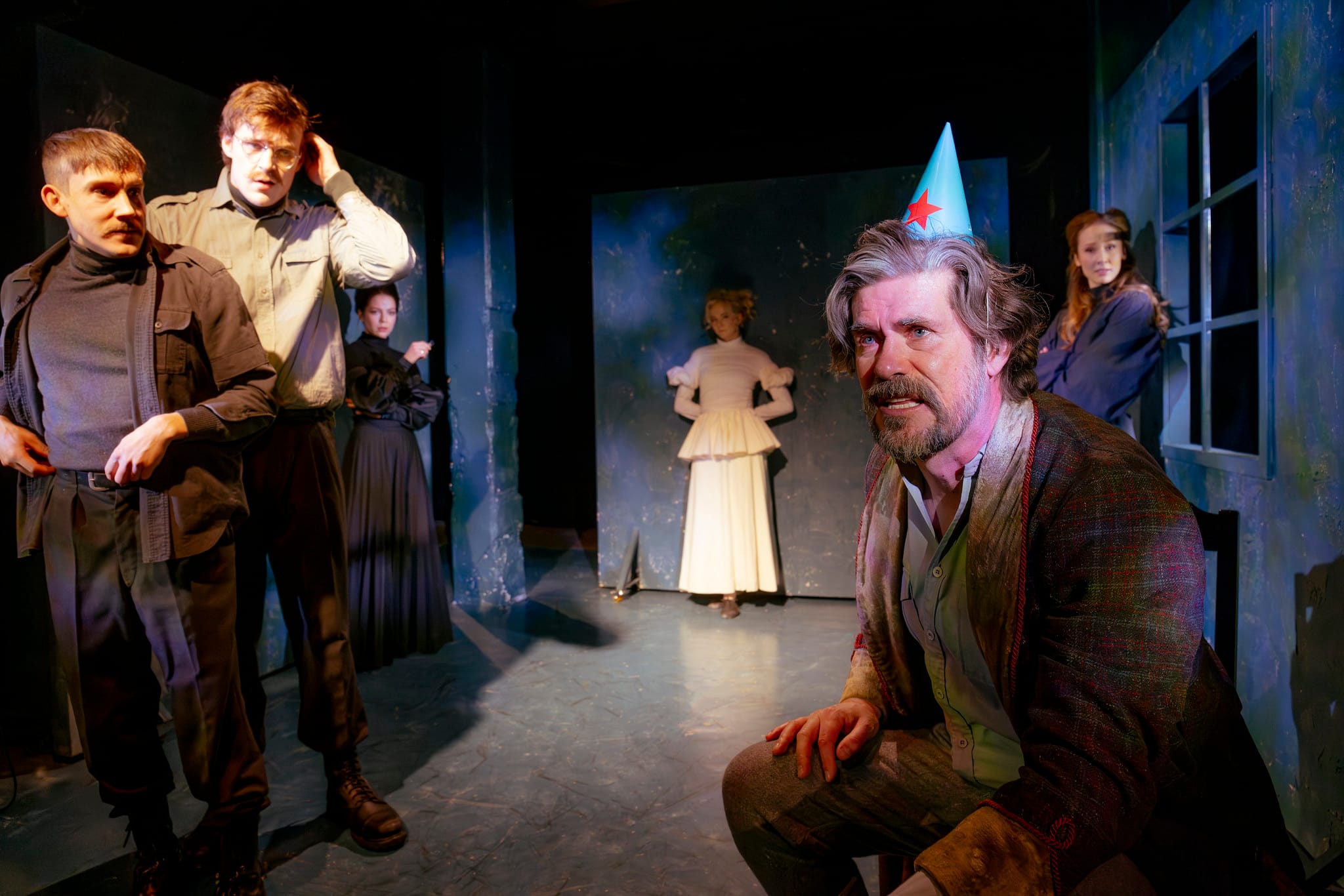 Jo Irinan (Jessica Penttilä) nimipäiväjuhlissa on vetoa ja menoa kuin Teatterikorkeakoulun kurssikaronkassa. Intensiteetti on silti vahvimmillaan hahmojen pitäessä brechtiläisessa hengessä julistavaa puhetta suoraan yleisölleen: tässä Korpelan Chebutikinin ohella kunnostautuu etenkin Aapo Puustin Veršinin. Tietenkin myös sisaret sekä veljensä Andrei (Ville Hilska) ja hänen nousukasmainen hirviöpuolisonsa Natalia (Rebecca Nugent) saavat kukin vuorollaan todistaa omaa tähdellisyyttään neljännen seinän läpi.