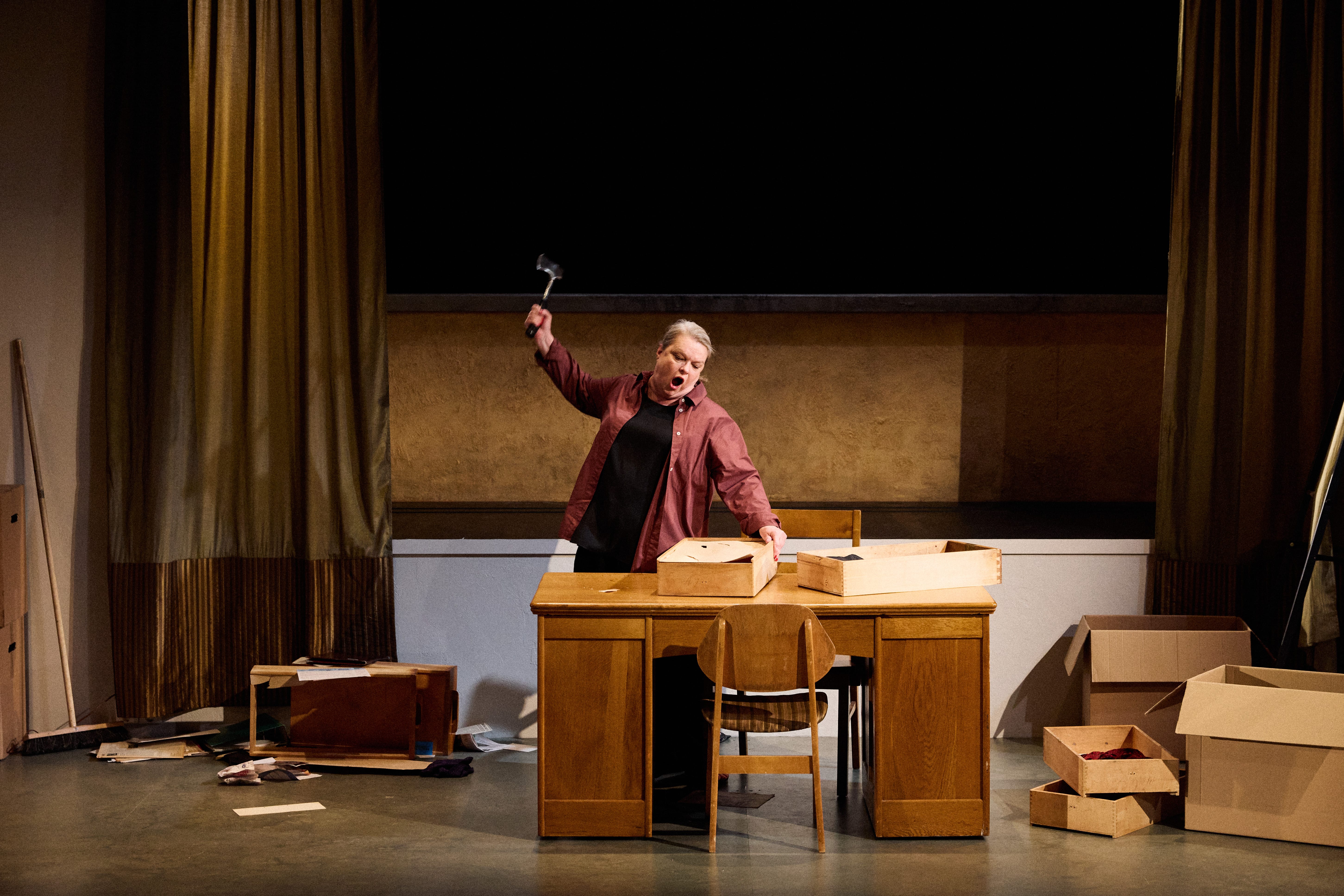 Elina Knihtilän esittämä opettaja moukaroi yhtä aikaa mennyttä, tätä hetkeä ja tulevaa. Kuva: Ilkka Saastamoinen.