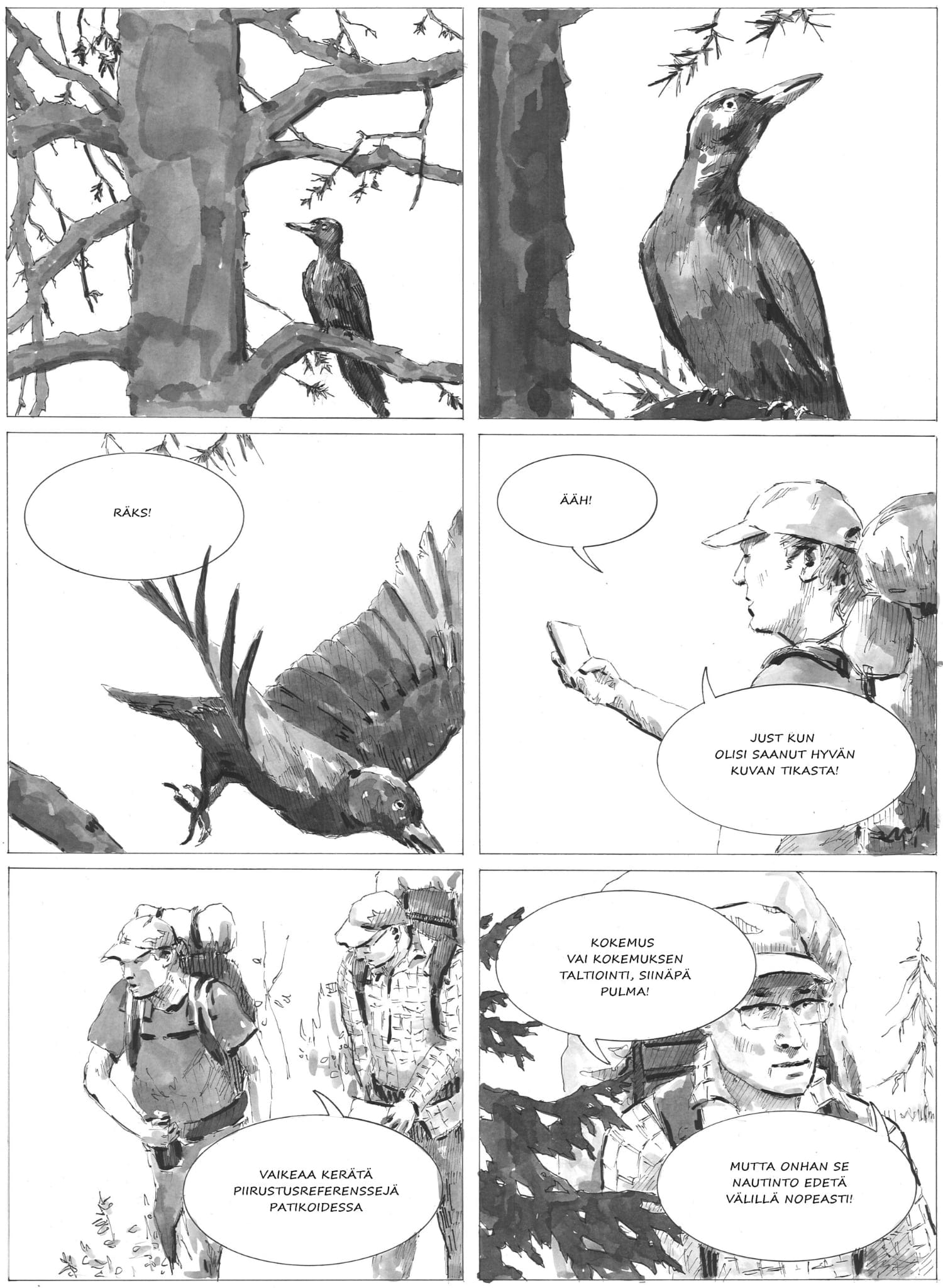 Harmaasävyinen kuvitus tekee oikeutta metsän muodoille ja valolle sekä luo tarinaan vanhahtavaa suomifilmien henkeä. Albumi on taiteilijaveljesten yhteistyöprojekti, molemmat ovat käsikirjoittaneet ja piirtäneet tarinaa vuorotellen. Piirrosjälki muuttuu muutaman sivun välein fotorealistisemmasta pelkistetympään ja takaisin. Muutoksiin ei välttämättä kiinnitä huomiota, sillä kuvakerronnan tyyli ja rytmi pysyvät samanlaisina.