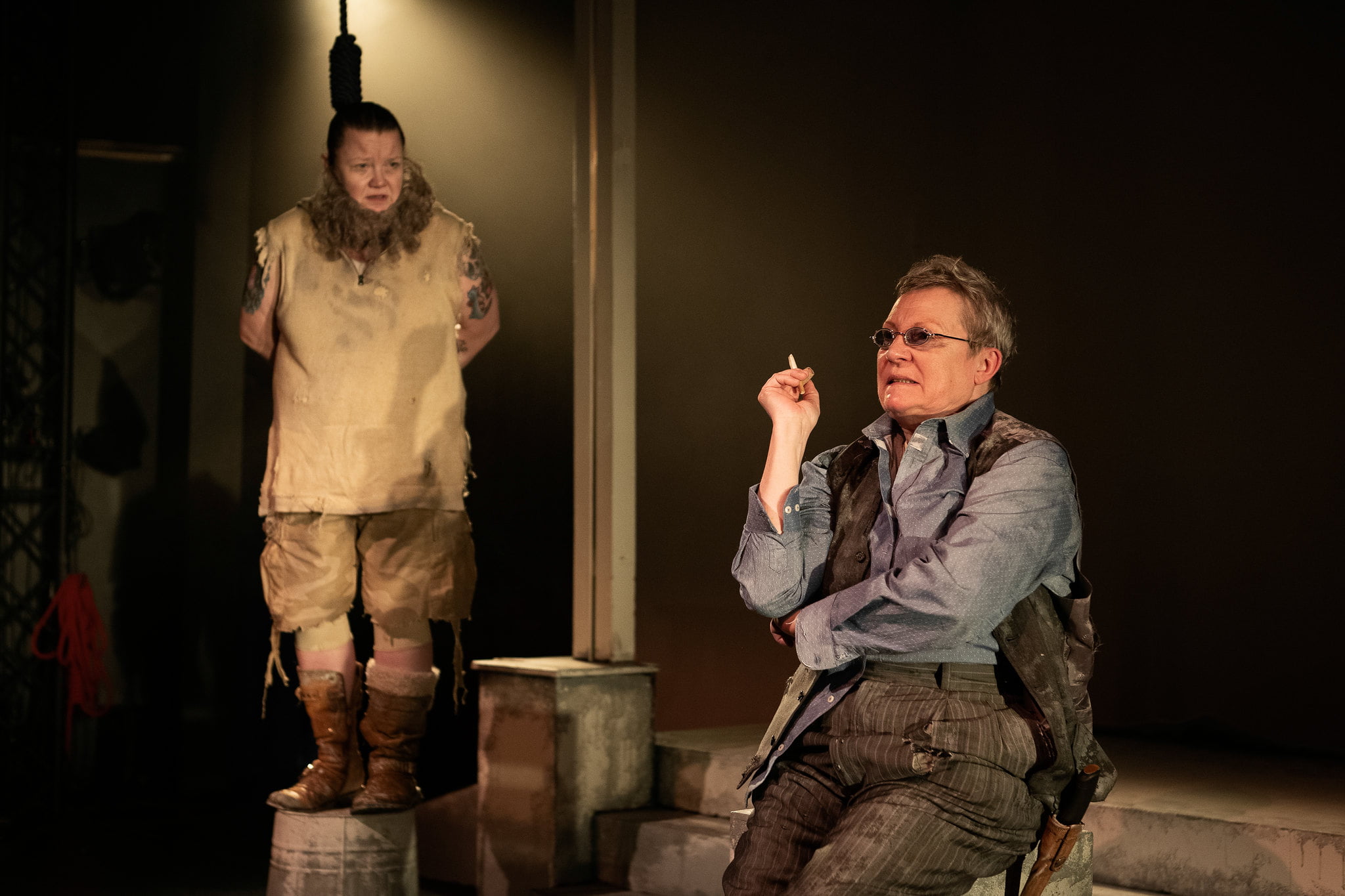 Keskellä näyttämöä roikkuu hirttoköysi, laidoilla lojuu ruumiskasoja. Yhden kasan alta könyää olento. Se leikkii löytämällään kankaanpalalla kuin se olisi morsiamen hääpuku, mutta päätyy sittenkin vetämään naamalleen maasta noukkimansa tekoparran. Sitten hahmo kiipeää laatikon päälle, vetää hirttonarun kaulaansa ja jää odottamaan.