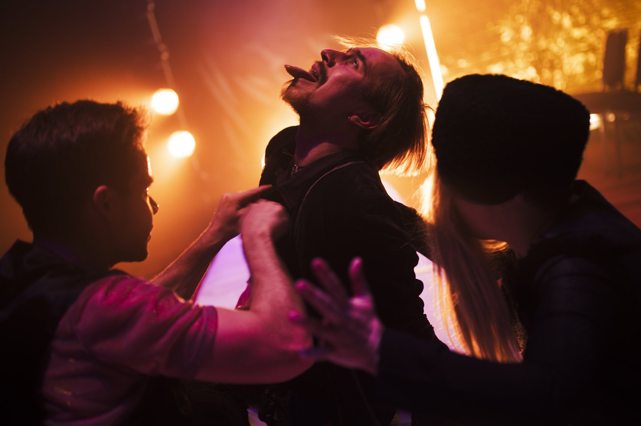 Esityksen edetessä hahmot kompuroivat esitystilaa halkaisevalle catwalkille, jonka toisessa päässä loimottaa tuonpuoleiseen kutsuva valoportti. Hahmojen via dolorosa kestää kauan, ja sen aikana he kukin poikkeavat reitiltä omalla tyylillään. He myös taantuvat lapsiksi elleivät peräti alkuihmisiksi, tuntevat eksistentiaalista pakokauhua ja sitä lievittävää yhteisöllisyyttä, horjuvat kehoissaan ja identiteeteissään ja jopa eläytyvät omaan kuolemaansa.