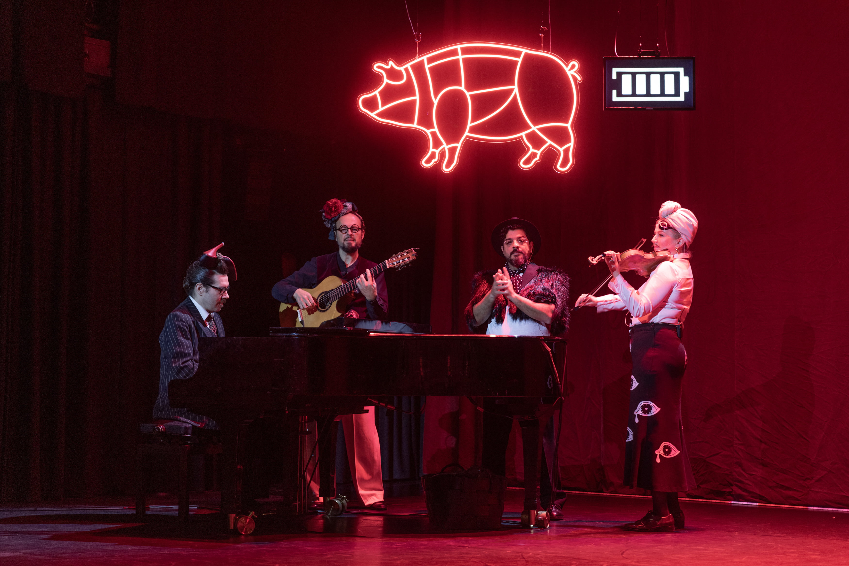 Yleisön könytessä saliin lavan vasempaan laitaan valmiiksi kotiutunut flamencobändi täyttää jo tilaa hypnoottisilla rytmeillään. Näyttämön takaseinää verenpunaiseksi värjäävien verhojen edessä roikkuu lihakoukku, jonka alla makaa alaston mies. Leveän näyttämön toisessa reunassa odottaa leivätön ja juomaton pitopöytä.
