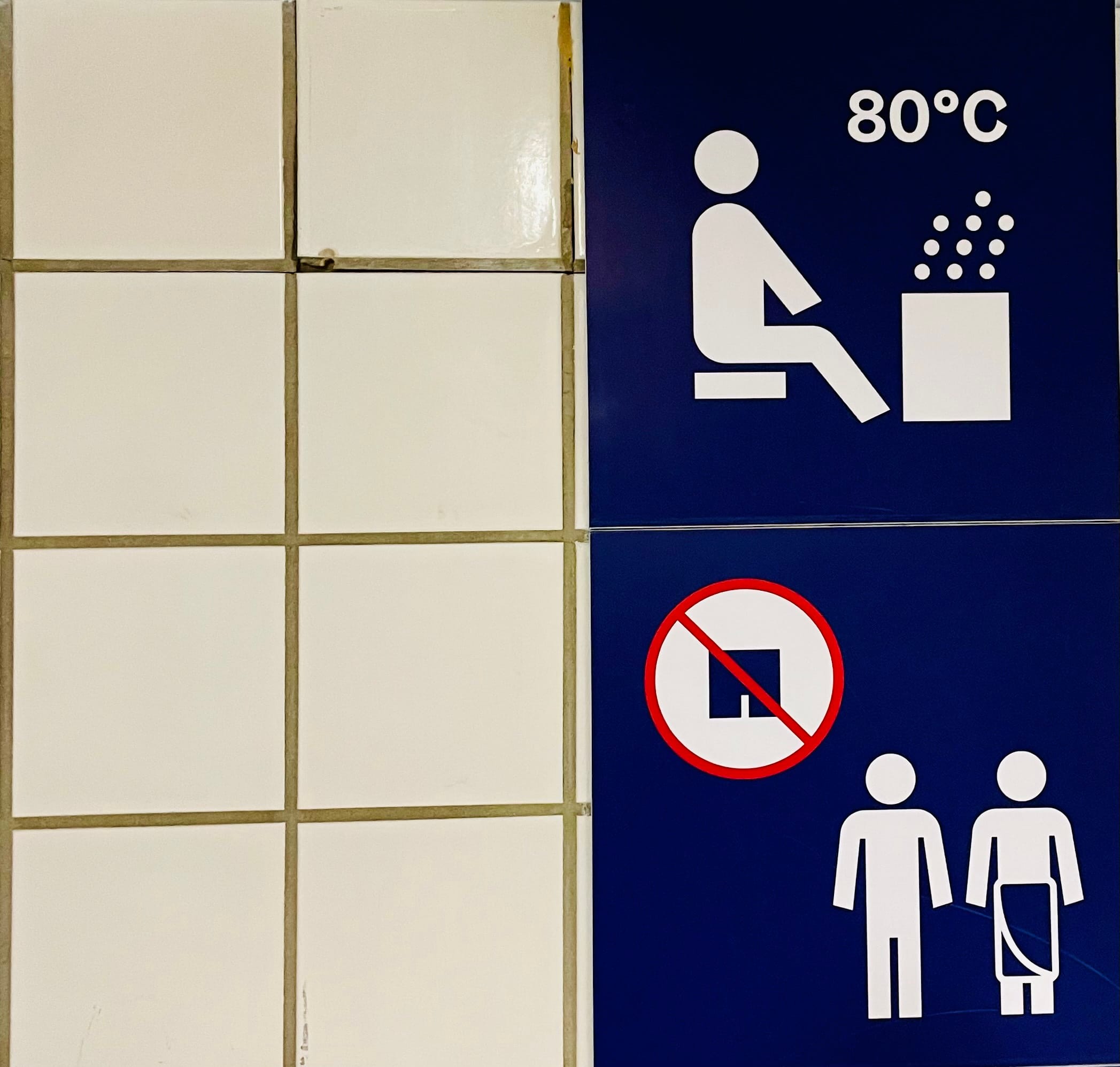 Uimahallin opasteikonografia on neutraalimpaa. Pelkistys tapahtuu VR:n vaunuopasteiden malliin: pallopää, sormia tai varpaita ei ensinkään.