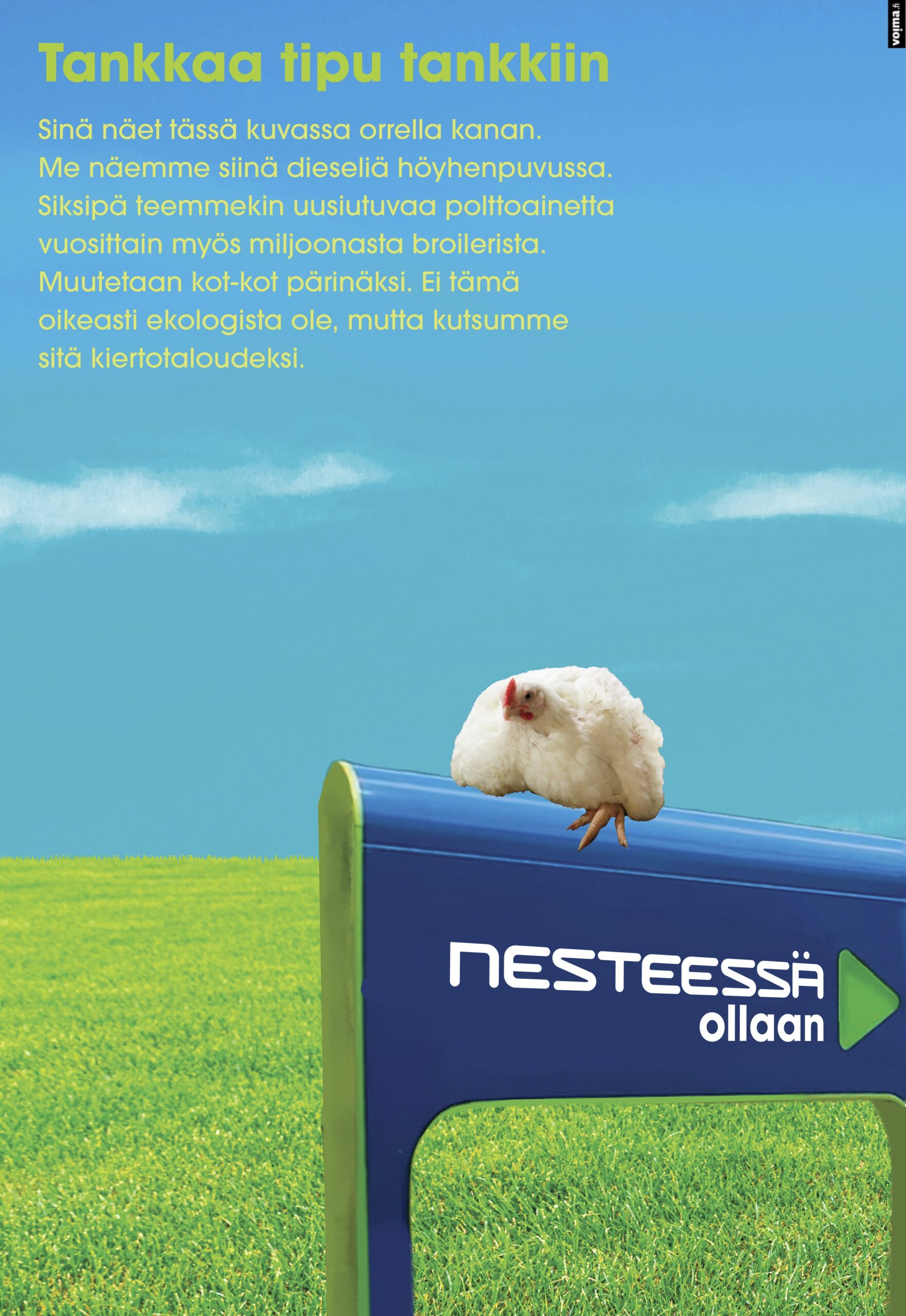 Yleisradion mukaan Suomessa kuolee vuosittain noin miljoona broileria ennen teurastamoon ehtimistä. Näiden broilerien ruumiita ei voida myydä ihmisravinnoksi, mutta ne tietenkin mieluusti myydään kiinnostuneille. Öljy-yhtiö Neste on kiinnostunut ja se kierrättäänkin ruumiit uusiutuvaksi polttoaineeksi. Näillä eläin- ja ruokataollisuuden ylijäämillä korvataan palmuöljyä polttoaineen raaka-aineena. Tämä on sikäli järkevää, että palmuöljyn tuottamista voi kuvailla lähinnä ympäristörikokseksi.