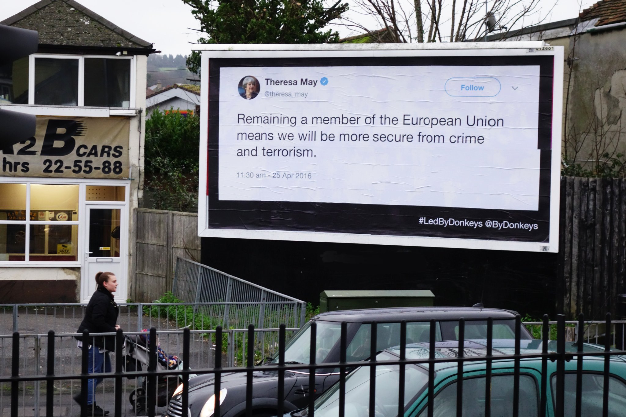 Kaoottista tilannetta kuvatakseen ja kommentoidakseen, neljä englantilaista heppua päätyivät suunnittelemaan neljä suuren ilmoitustaulun kokoista julistetta, jotka he kävivät liisteröimässä mainostauluihin omin luvin. Liisteröidyt julisteet olivat lainanneet sisältönsä brexitiä ajavien poliitikkojen päättömistä tviittauksista ja lausunnoista.