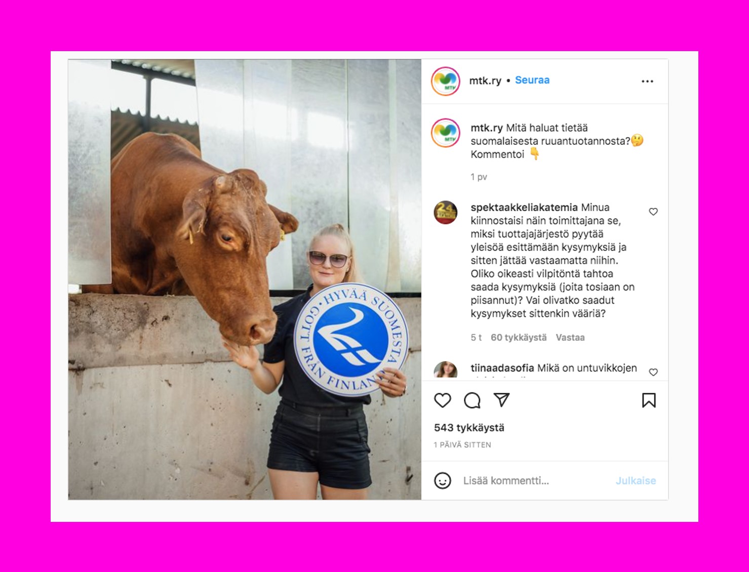 Maa- ja metsätaloustuottajain Keskusliitto MTK kysyi Instagramissa yleisöltä ”Mitä haluat tietää suomalaisesta ruuantuotannosta?”. Internet teki työtä käskettyä ja kommenttikenttä täyttyi kysymyksistä. Harmillisesti tuottajajärjestö ei halunnut juurikaan näytä vastaavan esitettyihin kysymyksiin. Pääosin yleisön esittämät kysymykset liittyvät eläinten asemaan tuotantoprosessissa ja eläinten oikeuksien toteutumiseen. Myös kotimaisena markkinoidun lihan tuotantoprosessin kotimaisuusaste kiinnostelee ja tietenkin ilmastokriisi on mielessä.