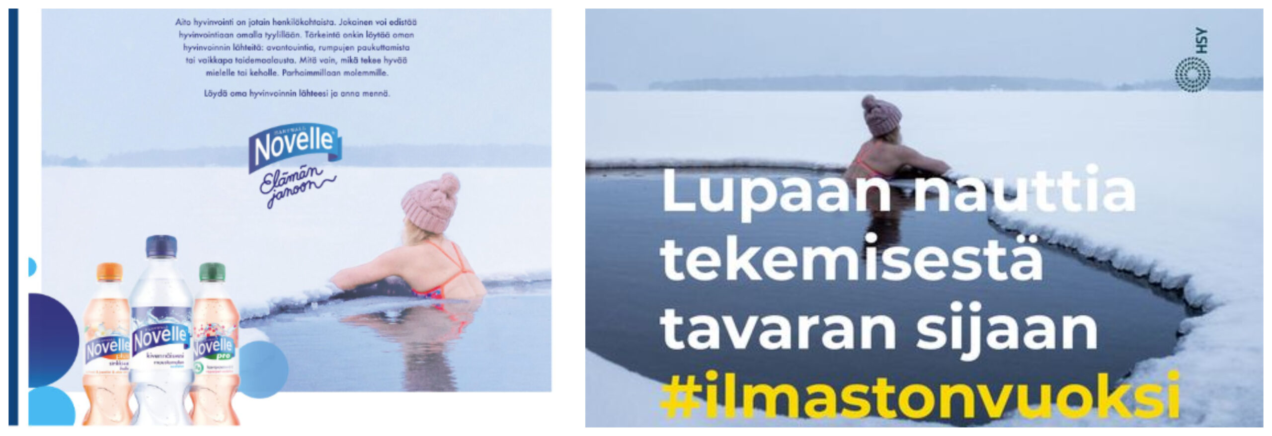 Tuotteiden toisteisuuden ohella huomio mainosten toisteisuudesta palautui mieleen, kun huomasin Facebookissa Helsingin seudun ympäristöpalvelu HSY:n mainoksen, joka ei poikennut hirveästi viikkoa aikaisemmin Helsingin Sanomien kannessa nähdystä Hartwallin Novelle-mainoksesta.