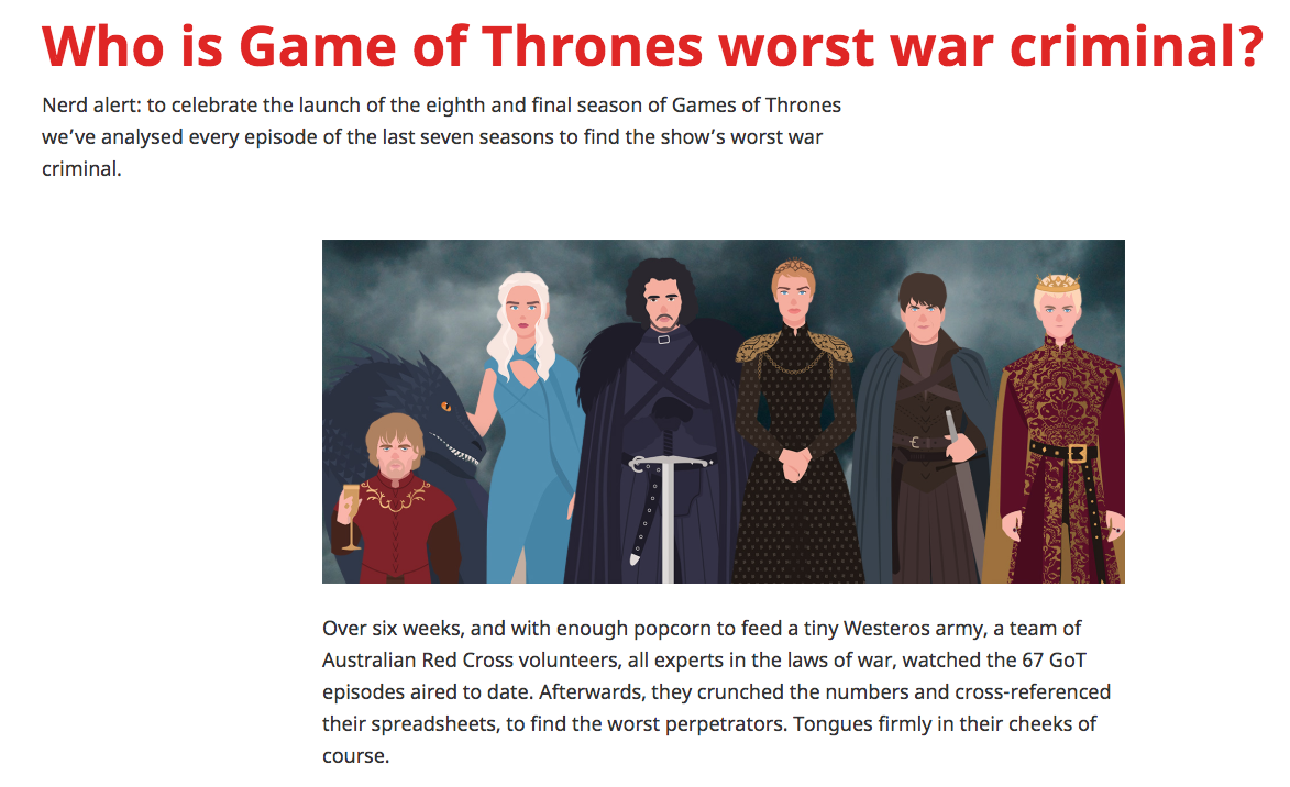 Game of Thrones -sarjan viimeinen tuotantokausi alkaa pian. Sen kunniaksi Australian Punainen Risti kävi läpi kaikki sarjan tähänastiset jaksot ja selvitti, kuka on dramaattisen tarinan pahin sotarikollinen.