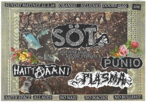 Punk-matinea Helsingin Oranssilla sunnuntaina 22.2.2026 klo 15.00 alkaen! Esiintymässä SÖT suoraan Katalonian Lleidasta sekä paikalliset parhaudet PLASMA, PUNIO ja HAITTAÄÄNI. Tapahtumassa noudatetaan turvallisemman tilan periaatteita. Oranssi on esteetön. Ei ikärajaa, ei päihteitä, ei häirintää! Liput 10€, maksu käteisellä tai mobilepay. Katalonialainen SÖT soittaa tarttuvan melodista, anarko-sävytteistä post-punkkia. Suomen ensivierailun taustalla on korvaamattoman punkvaikuttajan, Arto Hietikon […]