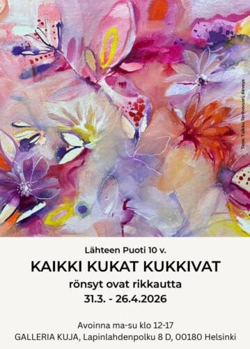 KAIKKI KUKAT KUKKIVAT 31.3. – 26.4.2026 Lähteen Puoti 10 v GALLERIA KUJA Lapinlahdenpolku 8 D, 00180 Helsinki Lähteen Puodin taiteilijat ja käsityöläiset haluavat juhlistaa Puodin kymmenvuotista eloa järjestämällä Lapinlahdessa näyttelyn, tai oikeastaan kaksi näyttelyä: Galleria Kuja huhtikuussa ja Lapinlahden Lähde Osasto5 12.5.-25.6.2026. Galleria Kujan näyttelyssä on esillä teoksia 12 puotilaiselta: Riitta Hinkkanen, Jaana Kangas, Iiris […]
